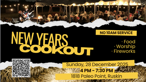 Join us for our New Year's Cook Out on Sunday, December 28th at 4pm. Sleep in Sunday morning and then grab your blankets, kids, and come out for a night of worship, an encouraging message, BBQ and fireworks!
